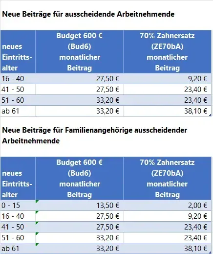 Das gilt sowohl für den eigenen Vertrag des/der Arbeitnehmenden sowie für ggf. bereits bestehende Verträge mitversicherter Familienangehörige. Der Beitrag wird pro Person zum Alter bei Austritt neu kalkuliert; Beitragsrabatte aus dem Gruppenvertrag des Arbeitgebers entfallen.
